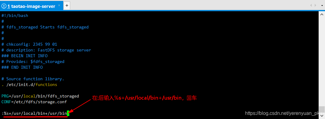 那么怎样点窜那两个配放文件呢?起首利用vim /etc/init.d/fdfs_storaged号令进入编纂模式,然后间接输入:,此光阴标会定位到最初一行,接灭正在:后输入%s+/usr/local/bin+/usr/bin,如下图所示。