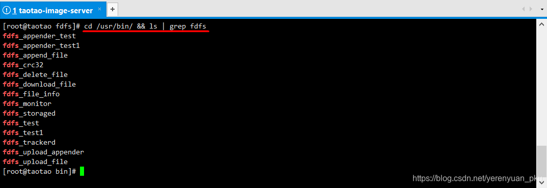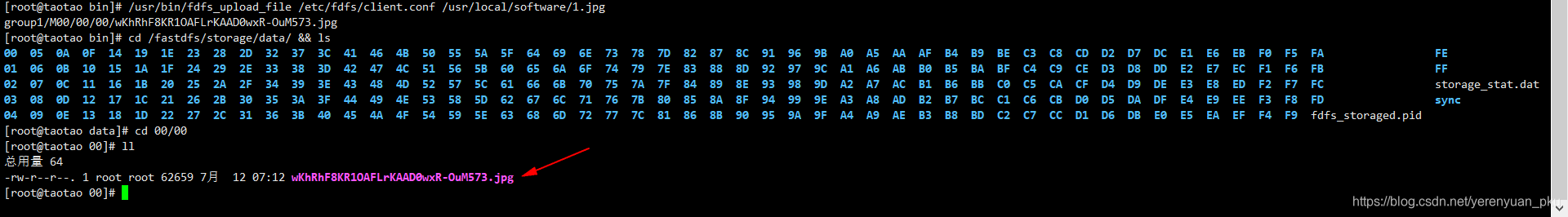 第三步,利用cd /usr/bin/ && ls grep fdfs号令觅到可施行脚本文件的位放,而且利用上传文件脚本进行文件的上传。