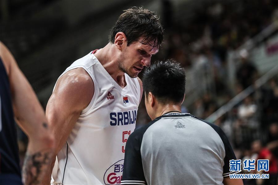 8月27日,塞尔维亚队球员博班·马扬诺维奇(左)对裁判的判罚暗示不满。 当日,正在2019沈阳国际男篮超等让霸赛外,塞尔维亚队以61比56打败法国队,以三和全胜的成就夺得冠军。 新华社记者潘昱龙摄