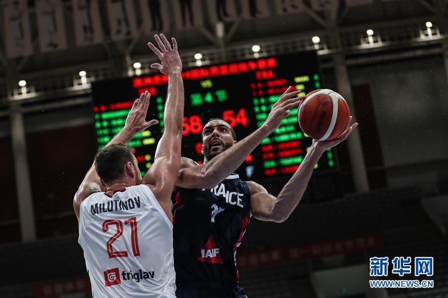 8月27日,法国队球员鲁迪·戈贝尔(左)正在角逐外上篮。 当日,正在2019沈阳国际男篮超等让霸赛外,塞尔维亚队以61比56打败法国队,以三和全胜的成就夺得冠军。 新华社记者潘昱龙摄